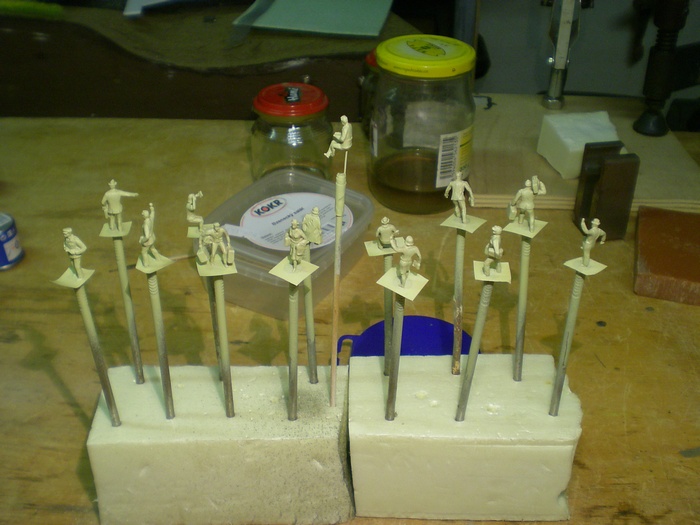 Zacal jsem hrubym ocistenim nalitku nozikem a zatmelenim direk po vyhazovakach kapickou surfaceru. Dale jsem podrazky bot zarovnal na smirku aby figurky meli na cem stat. Pak jsem je na oboustranou pasku nalepil na hlavicky hrebiku abych je mohl drzet v ruce.
