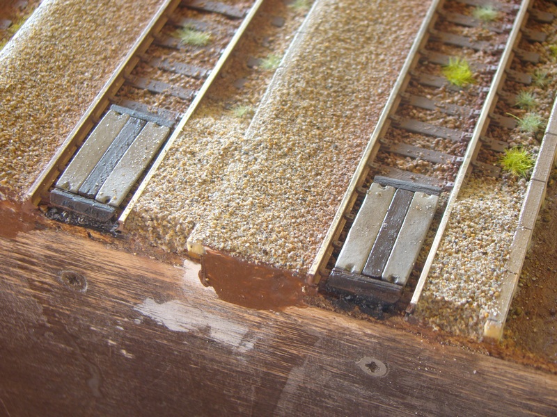 Takhle vypadají přechody zalepené mezi koleje. Lepil jsem dvousložkovým lepidlem tak snad to bude držet i na hranách. Dosypal jsem štěrk k přechodům zvlhčil vodou s jarem a zalel ředěným duvilaxem.