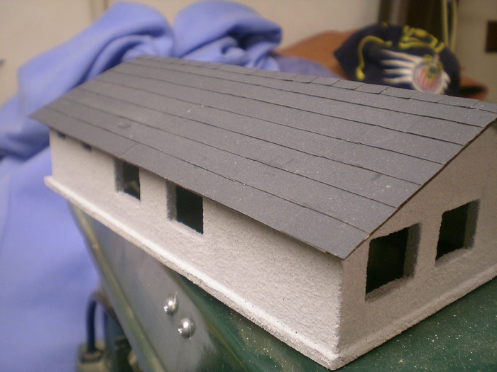 Vlasni pokladka: Narezat nebo nastrihat smirek na pasky cca 1cm siroke a 10cm dlouhe, aby simulovali skutecne pokladani pasu o rozmerech 1*10m. Ja jsem musel pasky zkratit, protoze budova je dlouha cca 20cm a pricne spoje by me vychazeli do jedne roviny a vypadalo by to blbe. Tak jsem delku pasu zkratil na 7cm, aby me spoje vychazeli ruzne. Pasky pokladat ze spodu aby modelova voda nezatekala do budovy a prekryvat prez sebe cca 1mm proste jak kdyz by to delal pokryvac.