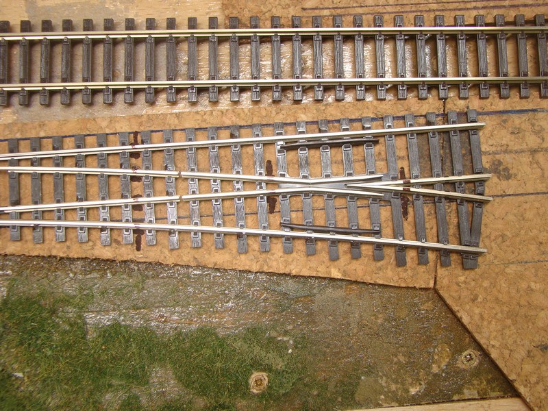 Teď to letovaní drátů. Je třeba prvně kolej a v mé ukázce i výhybku prvně na pokládku nachystat a rozmyslet si, kde chci dráty mít. Je víc než vhodné mít napájený opravdu každý kousek koleje, nespoléhat na spojky neboť pozdější oprava je daleko složitější než to zrovna udělat pořádně. Na kolej si navleču pruty a v místě kde chci mít dráty pražec buď vylomím nebo posunu spoj v podloží tak abych mel jeden vynechaný pražec. Jde to letovat i na tupo ale takhle je spoj pevnější. Nejsem počítač nýtů takže zbaběle používám vodivé i izolované spojky. Když vím co chci, tak si kolej položím do místa kde bude a zafixuju připínáčky. Zrovna na fotce to jsem je asi už vytáhl. Označím si místa kde budou dráty, a kde mě vychází táhlo pro přestavník. Značím obě osy a značím i na pruty neboť pak vím kde mám díry v podloží a kde má být drát.