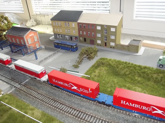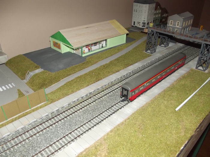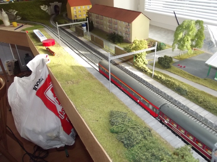 včera jsem byl na návštěvě u kolegy Broňka.Přišel jsem pofotit jeho pokrok ve stavbě dvoukolejných modulů.Dodělal už mosty a dvoukolejku s výškovým rozdíle,čeká se už jenom na lepty bran.Je to vidět na fotkách,kde jsou místo bran špendlíky.Další část dvoukolejky je zastávka s nadchodem,tady se Broňek vyřádil.dostal mě s obchodem,pěkná stavba je i rozestavěná budova nádraží.Podotýkám,že okna jsou kastlové.