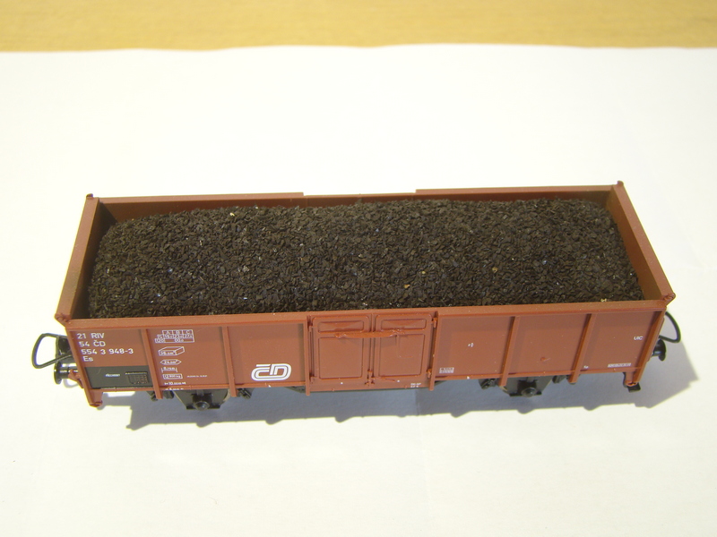 Nic neimituje uhlí lépe, než uhlí. Výroba je popsaná ZDE úplně dole. Styrodur natřený na černo jsem potřel hustým duvilaxem a do něj nasypal uhlí. Dělal jsem i test různých lepidel (Ponal, Herkules, ředěný sportakryl) ale nejlíp vypadal tento postup. Zkoušel jsem i fixovat již nalepené uhlí pro jistotu sportakrylem, ale udělal mě na povrchu povlak takže to nechám jen nalepené. Vypadá, že nic neodpadává.