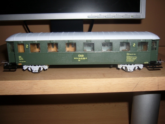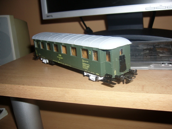 Tak po dlouhé době jsem se dostal k pokračování na vagónu,slepil jsem a vyztužil kousky mosazného plechu originální podvozky