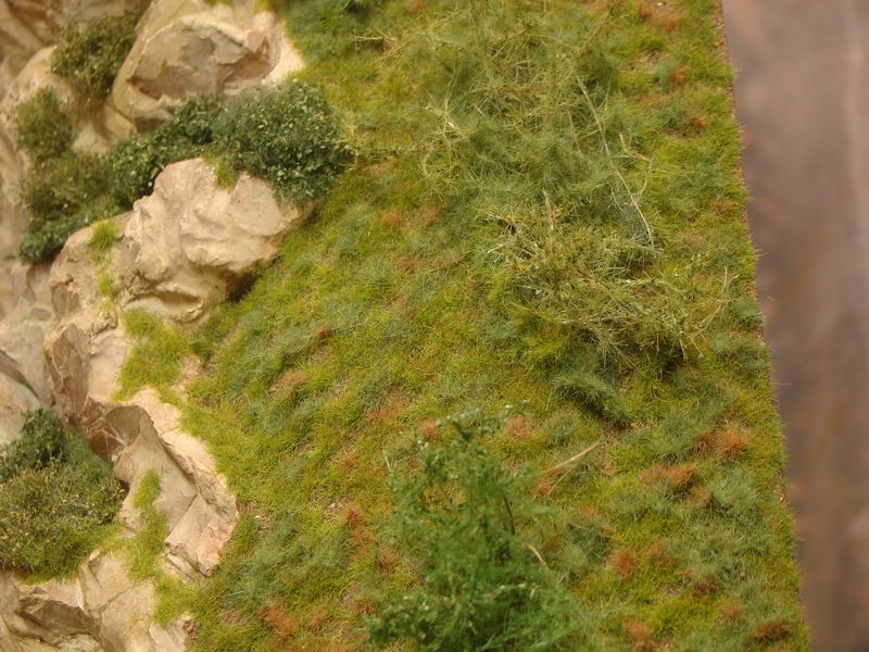 Po zaschnutí jsem začal flokovat. Flokuju tímhle. Používám trávy od Poláka, heki, auhagenu prostě co se mě líbí. Flokuju stylem drnování, neboť tráva pokud není zrovna na golfovém hřišti roste v drnách. Lepím hustým duvilaxem, kapu jej z nadobky od peroxidu vodíku v několika vrstvách. Na Řáholci jsem použil moc rozdílné odstíny trav od sebe a není to ono ale flokovat hodně blízkými odstíny taky není ono neboť se tam drnování zas ztratí. Je to trochu věda ale ne žádná hrůza. Dá se něco i napravit přeflokováním.